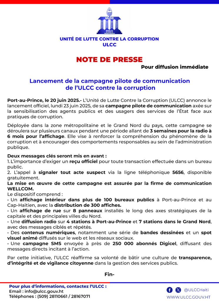 Remise de neuf (9) rapports d’enquête à la Justice haïtienne par l’ULCC